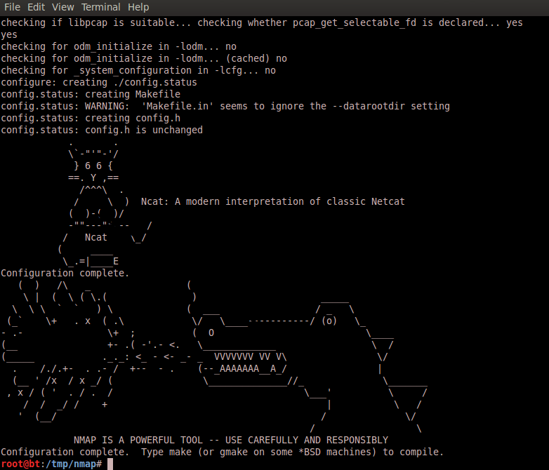 Then you can use the configure script to set up the different variables and parameters. Then run make to compile the code and generate the binary files. When building Nmap from source you can use ./configure –help to see a complete list of directives available