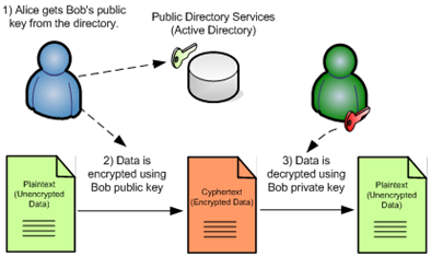 - Asymmetric encryption: Unlike the symmetric encryption that uses the same key, asymmetric encryption uses multiple keys. There are two mathematically related keys. It’s a key pair consisting of a public key and a private key which are used for the encryption and decryption process. If the public key is used for encryption, the associated private key is used for decryption – this is the encryption process. If the private key is used for encryption, the associated public key is used for decryption – this is the signing process. The private key should be kept secret and the public key can be freely distributed. The public key which can be an attribute of a digital certificate is usually published in a public directory service such as LDAP or Active Directory. You can also combine public-key encryption with hash algorithms to produce a digital signature. If Alice wants to send Bob a secret document they agree on a public-key cryptosystem. Bob then sends Alice his public key. Alice encrypts the secret document using Bob’s public key and sends it to Bob. Bob will decrypt the document using the same algorithm and his private key. Example of asymmetric encryption algorithms are RSA, DSA, ElGamal, and ECC. Below is an illustration of this process using a public directory service: