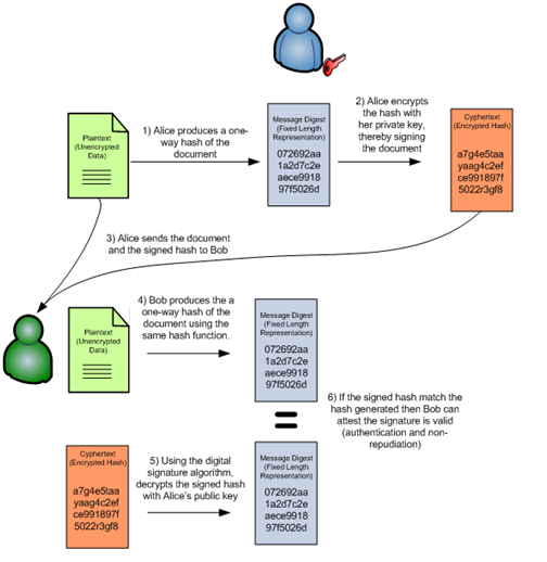 Authentication and Non-Repudiation assures the recipient of a message that the originator participated in the transaction and is who he or she claims to be. Authentication and non-repudiation is achieved through a combination of asymmetric encryption and hashing functions. Although encryption can keep data secret and protect against alterations, a digital signature proves the senders identity (authentication) and ensures the participation of the signer cannot be denied (non-repudiation). If Alice wants to digital sign a document and sent it to Bob they both agree on digital signature algorithm. Alice produces a one-way hash of the document. Alice encrypts the hash with her private key, thereby signing the document. Alice sends the document and the signed hash to Bob. Bob produces the a one-way hash of the document using the same hash function. Then using the digital signature algorithm, decrypts the signed hash with Alice’s public key. If the signed hash match the hash generated then Bob can attest the signature is valid (authentication and non-repudiation). The following picture illustrates this process.