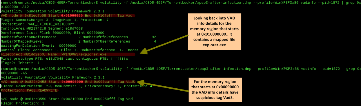 That being said the next step in our quest to find the malicious code. We will use these great plugins to look at the memory ranges that are accessible by the suspicious process virtual address space. This will allows us to look for hidden and injected code. Worth to mention that a great book with excellent resources and exercises about this matter is the Malware Analyst Cookbook from Michael Ligh et. al. Another great resource that also goes into great detailed and was published last year is the Art of Memory Forensics also from Michael Ligh and the Volatility team. Both books mention that among other things the VAD might be useful to find malicious code hiding in another process. Essentially, by looking at the memory ranges that have an access protection marked as executable specially with the PAGE_EXECUTE_READWRITE protection. This suggest that a particular memory range might be concealing executable code. This has been demonstrated by Michael Ligh and was translated into a Volatility plugin named Malfind. This plugin, among other things, detects code that might have been injected into a process address space by looking at its access protections. For this particular case Malfind does not produce results for the explorer.exe (PID 1872). Might be due to the fact that permissions can be applied at a further granularity level than the VAD node level.
