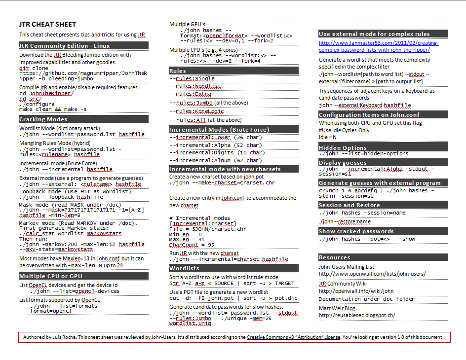 I created a quick reference guide for John the Ripper. Useful for those starting in order to get familiar with the command line. Download it here: JtR-cheat-sheet.
