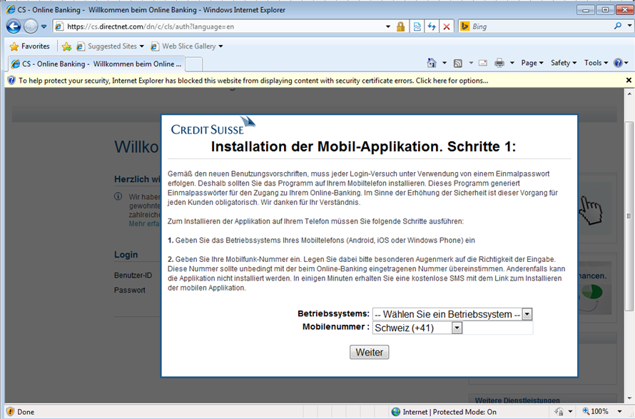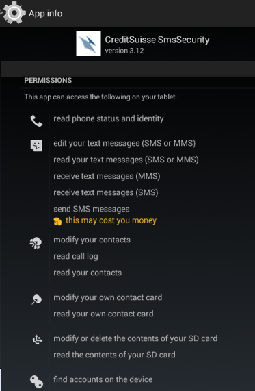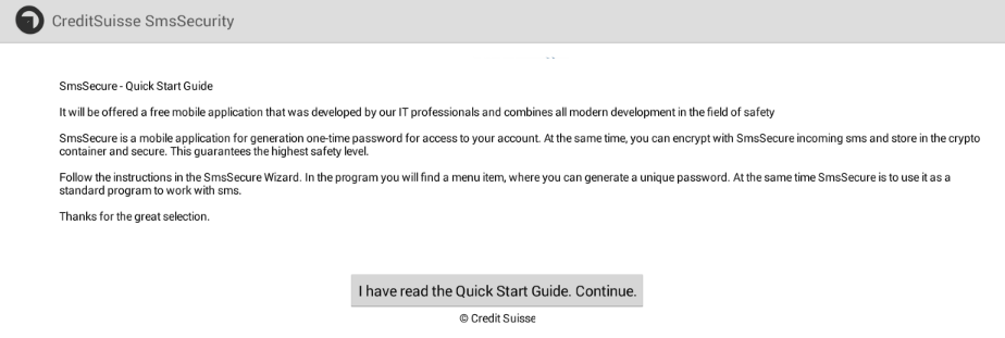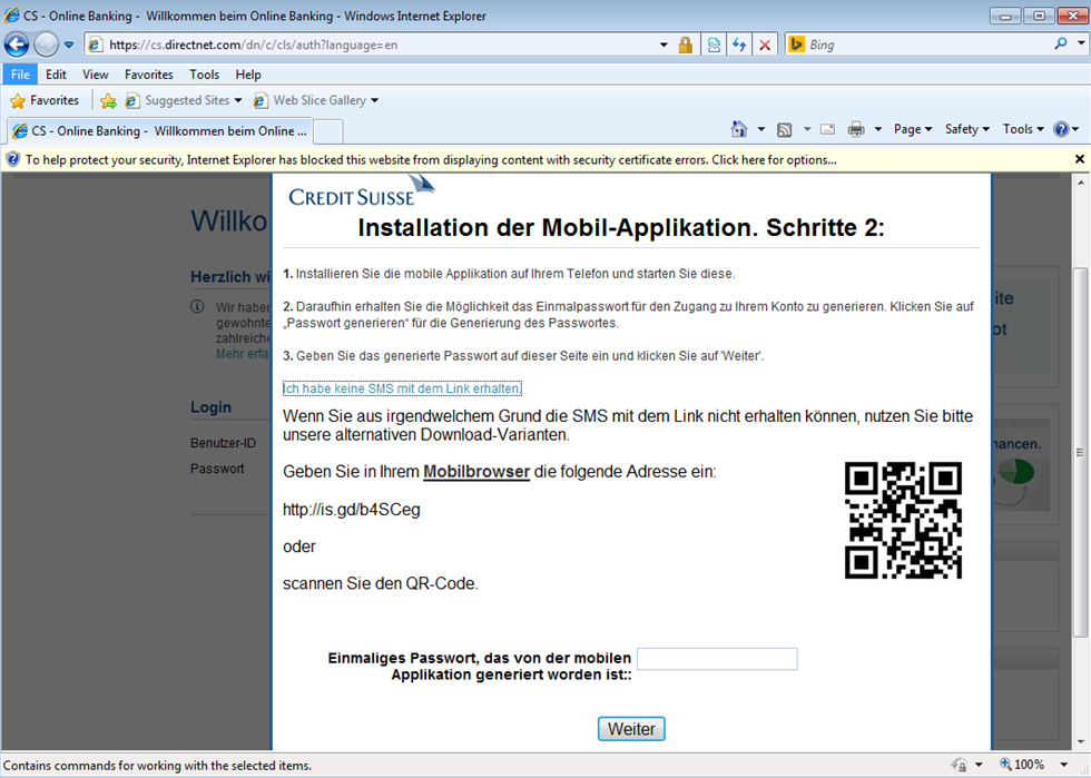 Current version of Retefe only targets Android phones. After entering a mobile phone, the user will be prompted to install a new banking mobile application. The victim will receive a SMS on his mobile phone asking to install the new APK. The APK is hosted on a site owned by the threat actors. One example of an APK is CreditSuisse-Security-v-07_02 1.apk (sha1: 4bdc5ccd3e6aa70b3e601e1b4b23beaf09f33d7a). If for some reason the victim does not receive the SMS, then a screen is shown in order to encourage the installation of it using a QR code.
