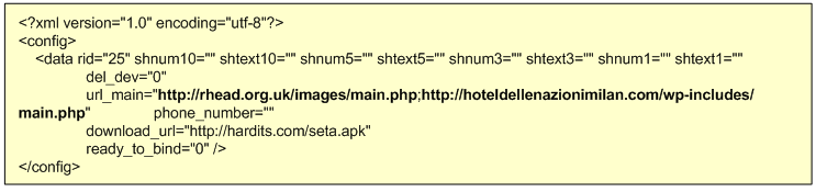 In this case the threat actors reused the code from Signal Android to implement the the Command and control (C2) communication. The traffic uses the Blowfish symmetric algorithm. It communicates with a primary C2 and if it fails it tries a backup address. The C2 addresses are stored in file named config.cfg which can be found in the decompiled APK. The data stored in the config.cfg and the traffic can be decrypted with Blowfish in CBC chaining mode. The key and IV used is also stored in the APK. The picture below shows the decrypted configuration file which contains the addresses of two compromised servers that are used to then communicate to the Retefe backend.