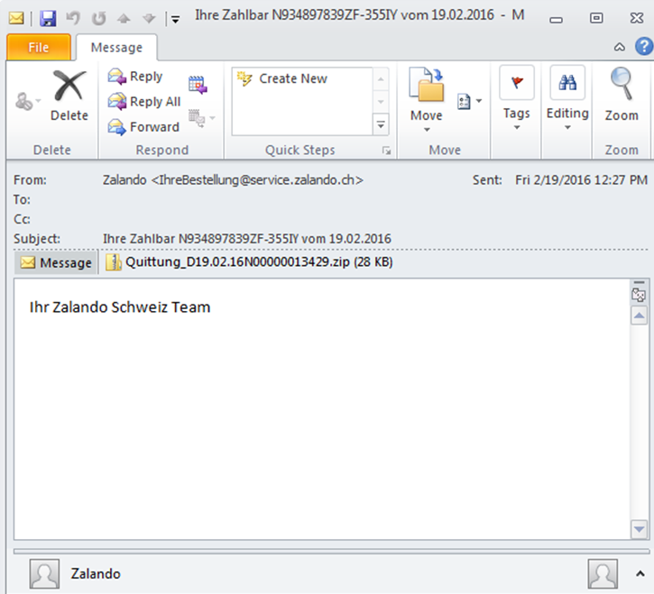 The threat actors behind the Retefe malware use phishing emails as main infection vector. The emails are tailored to match the country that they are targeting. In Switzerland for example, the lures take advantage of social engineering techniques by impersonating institutions like Zalando and Ricardo to trick the users into executing the malware. One recent phishing campaign contained a ZIP with a malicious executable inside (SHA1 : 32ed8fb57e914d4f906e52328156f0e457d86761). The image below illustrates one of these emails. The sender falsely mimics a legitimate business transaction from Zalando.