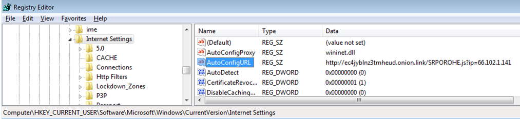 At execution the first request is a HTTP request to checkip.dyndns.com or icanhazip.com in order to determine the victim public IP address. Interesting the request does not have an User-Agent. The IP addresses value returned is then used to append to another request which is used to retrieve the Proxy PAC config that is written to HKEY_CURRENT_USER\Software\Microsoft\Windows\CurrentVersion\Internet Settings\AutoConfigURL setting in the registry. This setting modifies the victim browser Proxy-PAC setting that allows the traffic to be redirected to a malicious proxy server.