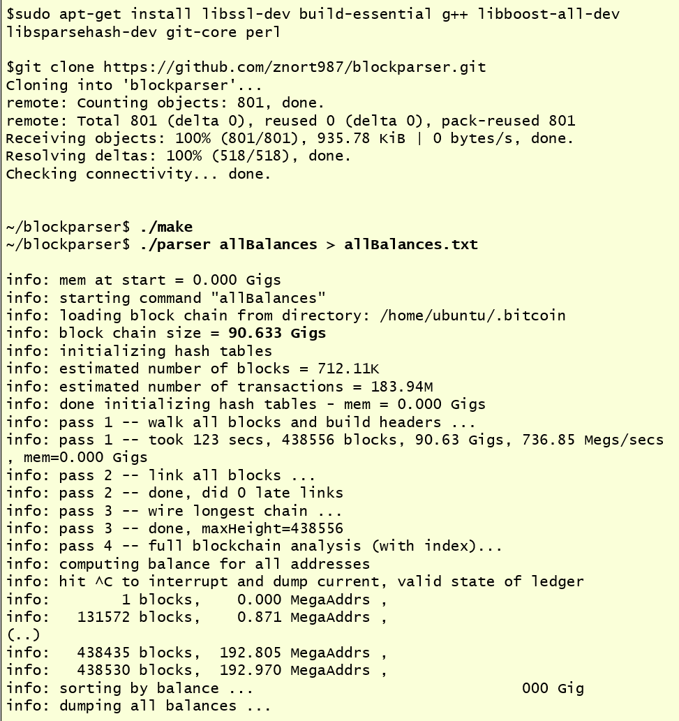 After downloading the entire Blockchain we move into the second step. Parse the Blockchain. The tool to perform this heavy lifting exercise is called Blockparser and is a powerful utility, open source, written in C++ that was created by Znort987. The tool doesn’t seem to be maintained anymore but is still able to perform its work. When blockparser performs the parsing, it creates and keeps the index in RAM which means with the current size of the blockchain you need enough RAM to be able to parse it in reasonable amount of time. The tool can perform various task but for this exercise we are interested in the allBalances command. To perform the parsing, I used a system with 64 GB ram and the process was smooth. I tried it on a system with 32Gb and stopped it due to the heavy swapping that was happening. The allBalances produced a 30Gb text file. The image below exemplifies these steps.