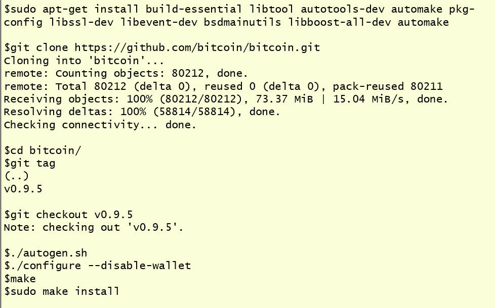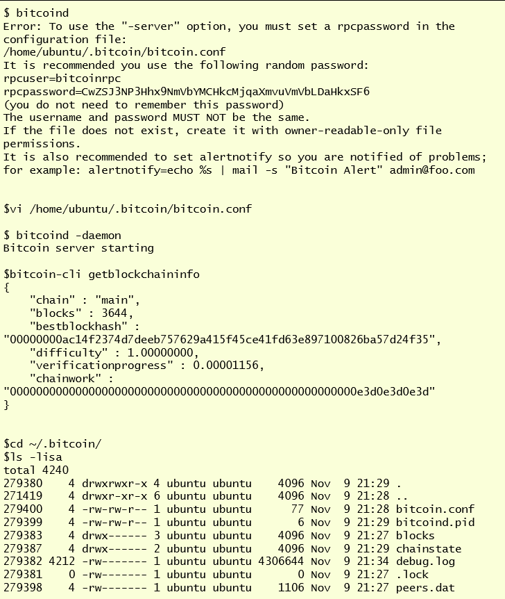 Then, the picture below illustrates the steps needed to perform the configuration and running the bitcoin software. You can view the progress by executing the getblockchaininfo command and check the number of blocks that have been already downloaded.