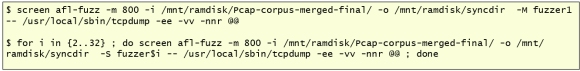 Then, start fuzzing! When you start AFL for the first time, you might want to start it without screen, to make sure it executes properly because AFL might printout instructions about tuning that needs to be performed on the operating system such as checking core_pattern and the CPU scaling governor. After having the master node running, I start the slave nodes. In this case I’m using a system with 32 cores, so I should be able to run 32 instances of AFL.