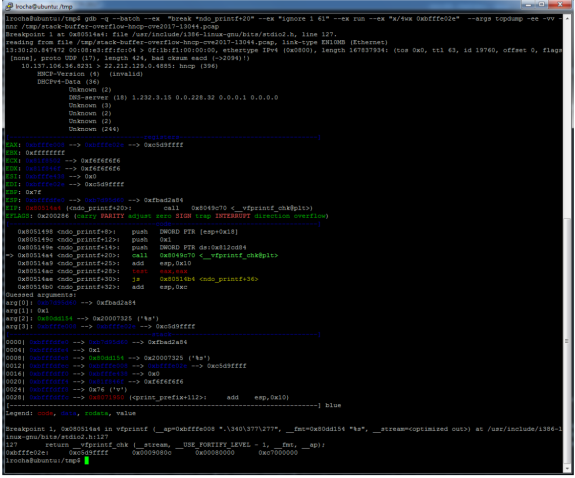 So, after that, in an attempt to understand more, you could identify the function and look at the tcpdump source code and also start to debug it with a debugger. Other than that I wanted to understand if by changing a particular byte in the input file I could control something. Therefore I mapped the packet capture to the protocol in question (HNCP) which is described in RFC7788. After some trial and error, it seems there are a 2-bytes in the “Prefix Length” field that cause the buffer over read condition. The picture below shows the hex listing and mapping for the two crash conditions related to CVE-2017-13044. On the packet from the left, setting the HNCP “Prefix Length” on any value between 0x1f and 0x98 will make the ndo_printf() print stack contents. Other values don’t produce the leak. On the packet from the right, the range is from 0x25 to 0x98. So, I could see that I could leak at least 2 memory addresses from the stack but I couldn’t not find a way to control what is printed. Nonetheless, perhaps this packet capture could be merged with another one that has another bug that allows you to control, somehow, the saved return pointer and use the leak to bypass ASLR.