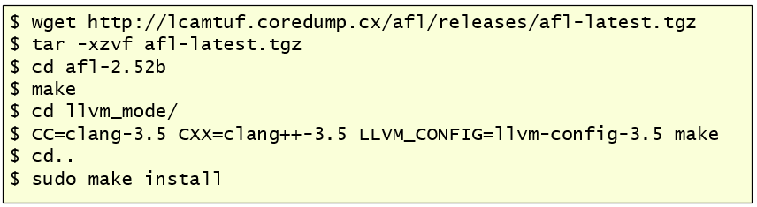Then, like in the previous article, I’m going to download AFL and compile it, but this time I also need to compile the LLVM mode support and give it the correct flags and version of Clang.