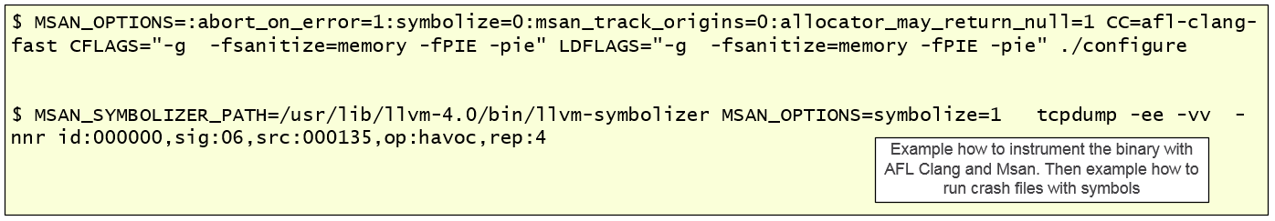 Before I continue, it is worth to mention that apart of running AFL with ASAN you could instead instrument the binary with MemorySanitizer (MSan). MSan is another address sanitizer that helps detect uninitialized memory reads in C/C++ programs which occur when a program tries to read allocated memory before it is written. For sake of brevity I’m only showing how to instrument tcpdump with MSAN and run a crash file report with symbolized stack trace for debugging purposes. MSAN needs a newer version of LLVM compiler infrastructure.