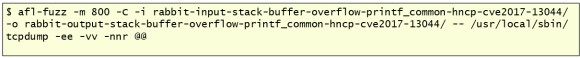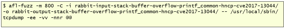 In this case, for illustration purposes, I executed AFL in crash exploration mode using as input the file “stack-buffer-overflow-printf_common-hncp-cve2017-13044.pcap”. This is a packet capture that triggers CVE-2017-13044 : HNCP parser in tcpdump before 4.9.2 has a buffer over-read in print-hncp.c:dhcpv4_print(). After a few minutes, AFL was able to determine 42 unique crashes. This means 42 unique code paths that lead to the same crash state.