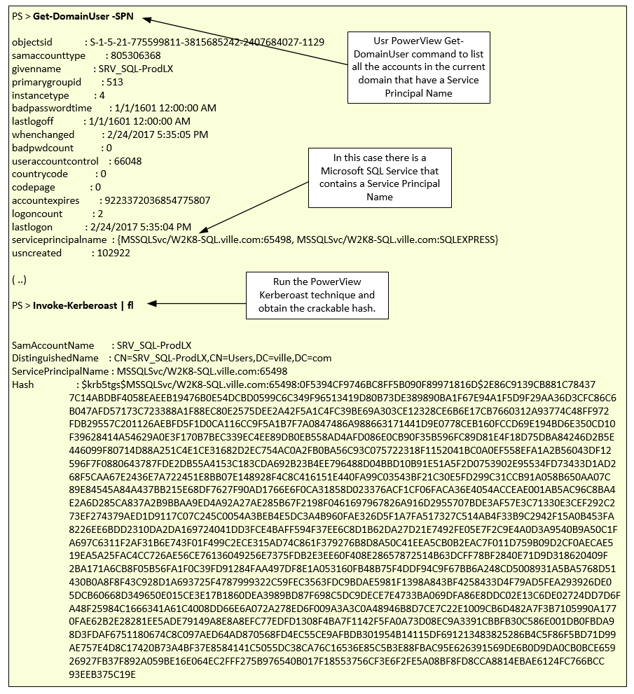 So, to start, the attacker can leverage the Kerberoasting technique. This technique pioneered by Tim Medin – I recommend you watch his presentation “Attacking Kerberos – Kicking the Guard God of Hades” – is brilliant and exploits the way Kerberos functions inside a Microsoft environment. This technique has been reorganized and adopted by PowerView and to run it is as simple as to list all user accounts in the active directory environment that have a SPN, request a Kerberos ticket and extract the crypto material. Then crack it offline to obtain clear text password. You can read more about it in this two articles written by William here and here. The below picture illustrates the Kerberoasting technique.