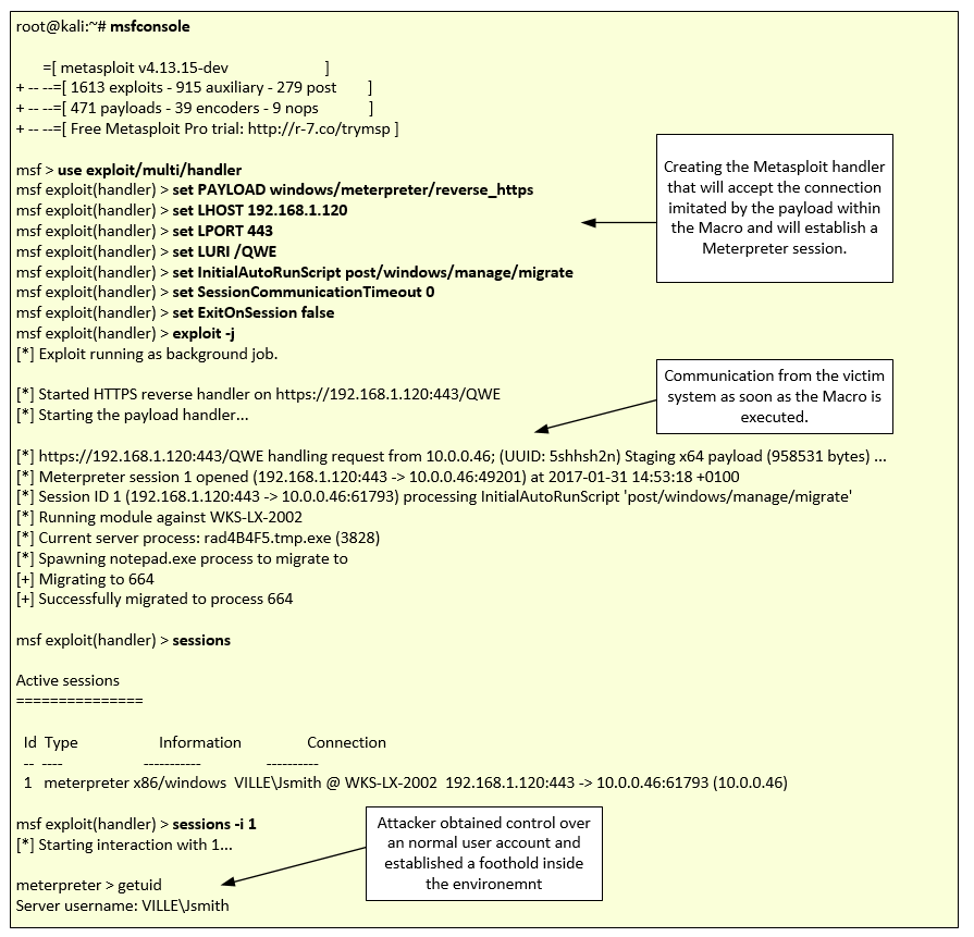 The picture below depicts the steps performed by the attacker to launch the Metasploit handler that will accept the beacon from the malicious document. Then, it shows the communication received and the established session.
