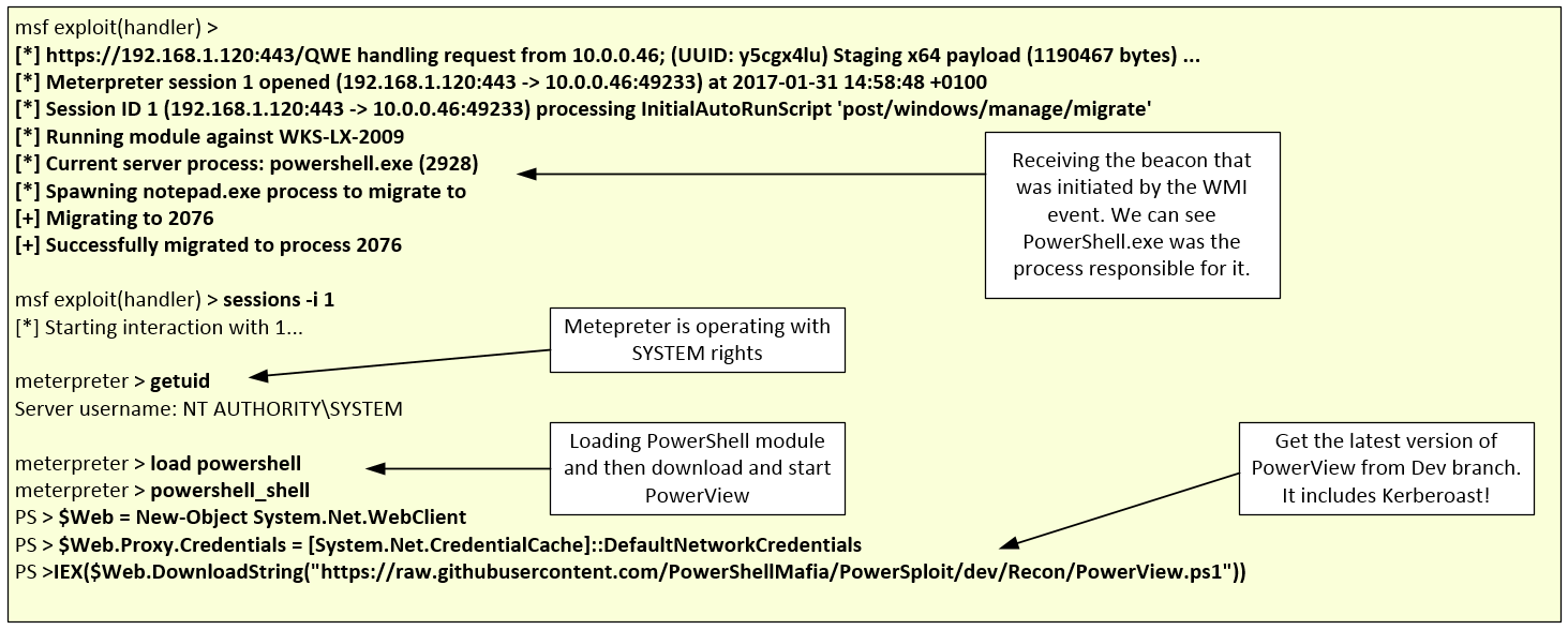 Next, action on objectives! Lateral movement has been traditionally done using a variety of commands and tools such as net.exe, psexec.exe and wmic.exe. Nowadays, you can add PowerShell to the mix.. More specifically using the PowerView tool which was developed by William Schroeder and is part of PowerSploit tools and scripts. PowerView is an advanced active directory enumeration tool written in PowerShell that allows an attacker to gather extensive amount of information about a Windows enterprise environment. You can read more about the reason behind Powerview here. This great write-up demonstrates several use cases for PowerView. Once again, we can load PowerView from within our Meterpreter sessions. In this case, the session has SYSTEM privileges and was obtained leveraging the WMI persistence but PowerView can run with a normal account. The picture below exemplifies this step.