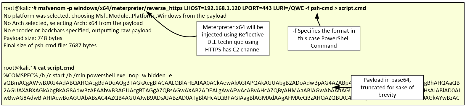Let’s see how the attacker can build this. To craft the payload the attacker could use msfvenom utility that is part of Metasploit framework. The following picture illustrates the use of msfvenom to create the Reflective DLL injection payload using PowerShell format.