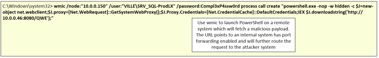 Then, is matter of pivoting inside the enterprise environment using the obtained privileged accounts. For that the attacker can leverage the netsh.exe port forwarding feature or the Meterpreter port proxy command to pivot between internal systems. This technique is commonly used by attackers that want to use an internal system as pivot, allowing direct access to machines otherwise inaccessible from the attacking system. The command in the picture below illustrates this, where after configuring the port forwarding on the compromised system, the attacker can use wmic.exe to launch PowerShell on a remote system that will connect back to the attacker system and establish a meterpreter session.