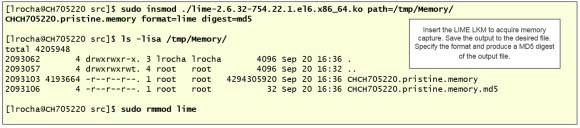 Next step is to run LiME with the insmod command. This step will acquire a memory sample in LiME format and in this case I also told LiME to produce a hash of the acquired memory sample. As an example the memory capture is written to disk but in a real incident is should be written to a network share, removable media sent via the network. Finally, you can remove the module with rmmod.