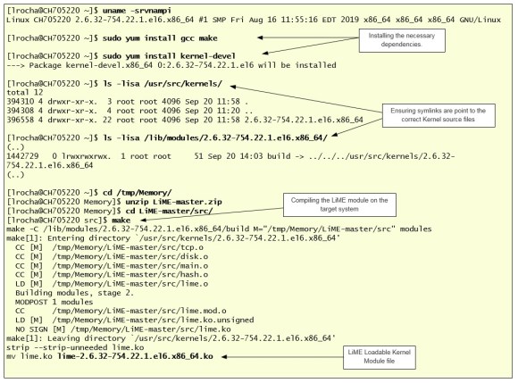The following illustration shows the steps for compiling LiME on the target system. I start by checking the Kernel version following by installing the necessary dependencies on this particular system. The LiME package can be retrieved from GitHub and can be made available to the target system using removable media, a network file share, or by copying into the system. Compiling LiME is an easy step.
