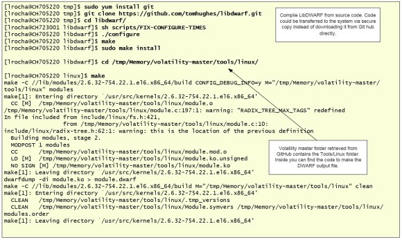After that, we need a Volatility profile for the Linux kernel version we are dealing with. On this version of RedHat I could not find a RPM for Libdwarf that contained the Dwarf tools. I had to get the source code from GitHub and transfer it to the system and compile it. Then, with the dependencies met I could compile and make the dwarf module.