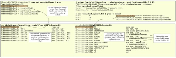 The linux_check_syscall plugin. This plugin will check if the sys_call_table has been modified. It lists all syscall handler function pointers listed in the sys_call_table array and it compares them with the address specified in the Kernel Symbols Table. If they don’t match, the message hook will be displayed.