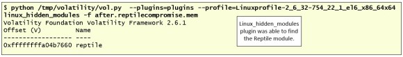 Now that I have a profile for the Linux system that I can try different Volatility plugins. In this particular case I was interested in determining what I could observe when looking with Volatility on a memory capture from the system after it has been backdoored with publicly available rootkits. There are several Volatility plugins for Volatility that can help identifying rootkits [10]. Let’s review three that might help with rootkits that leverage Linux Kernel Modules..
