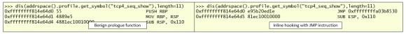 The following picture shows a comparison of a good tcp4_seq_show function on the left side from a memory capture of a pristine system and, on the right, it shows the same function but as we could see it has been patched to jump (JMP) to the Reptile code.