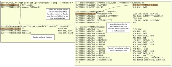 Another function that is patched by Reptile code in order to hide directories is the filleonedir. Not sure why Volatility didn’t detected this but the plugin might be easily adjustable to perform further checks and detect it. On the image below, on the left side, I used Volshell to check the function prologue on a pristine system. On the right side, we can see how the patched function looks like.