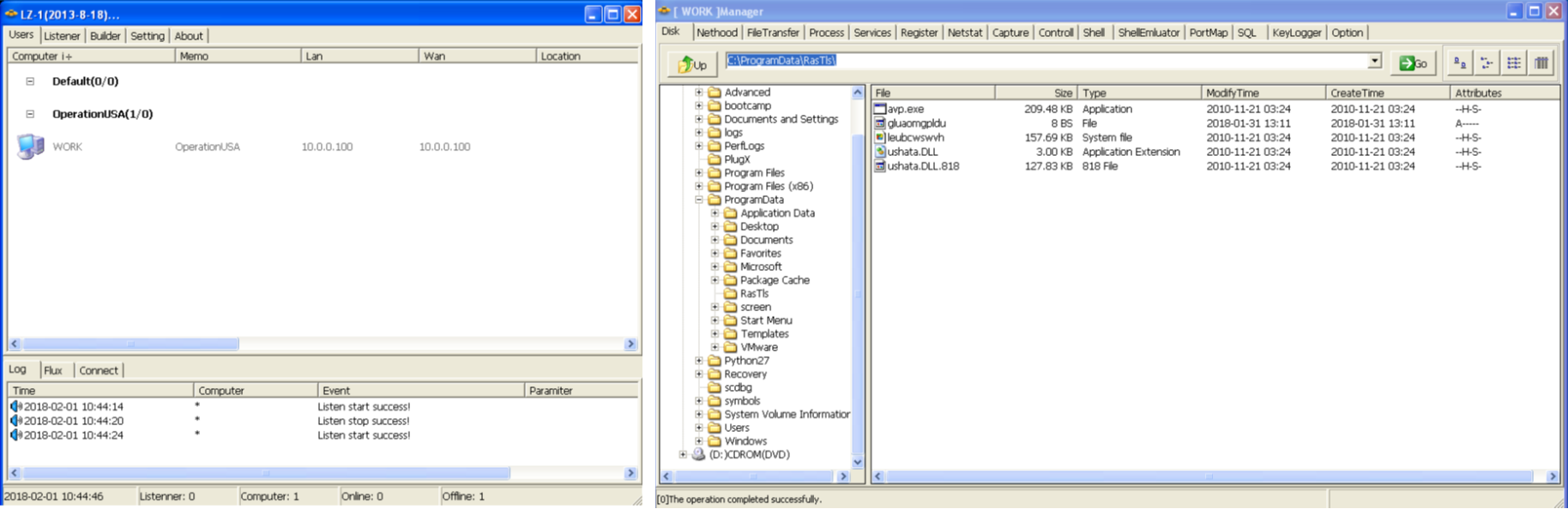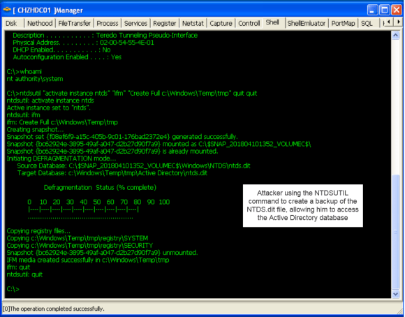 To access the Active Directory database, the attacker could, for example, run the “ntdsutil.exe” command to create a copy of the “NTDS.dit” file using Volume Shadow Copy technique. Then, the attacker can access the database and download it to a system under his control using the PlugX controller interface. The picture below illustrates an attacker obtained the relevant data that was produced using the “ntdsutil.exe” command.