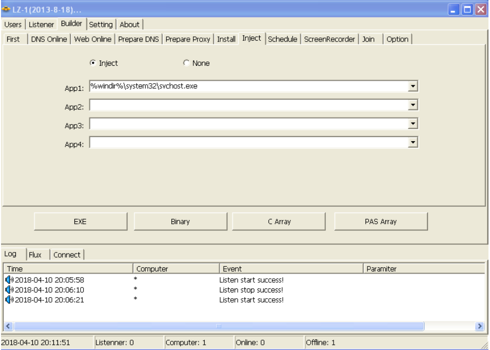 Then, In the inject tab I specify which process will be injected with the malicious payload. In this case I choose “svchost.exe”. This will make PlugX start a new instance of “svchost.exe” and then inject the malicious code into svchost.exe process address space using process hollowing technique.
