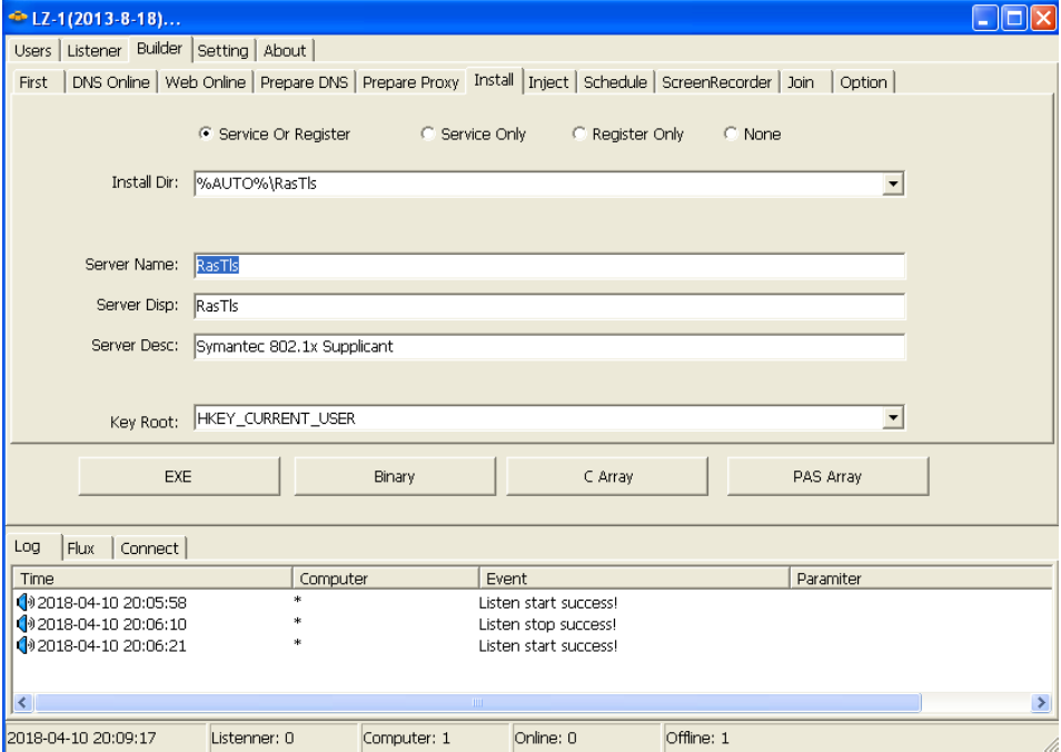 Next, on the Install tab I specify the persistence settings, in this case I’m telling the payload to install a service and I can specify different settings including where to deploy the binaries, the service name and service description. In addition, I can specify that if the Service persistence mechanism fails due to some reason the payload should install the persistence mechanism using the Registry and I can specify which HIVE should be used.