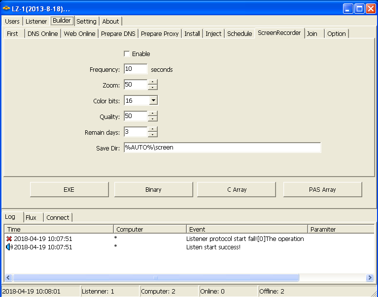 Other than that, the operator could define a schedule and determine which time of the week the payload should communicate with the C2. Also the operator could define the Screen Recording capability that will take screenshots at a specific frequency and will save them encrypted in a specific folder.