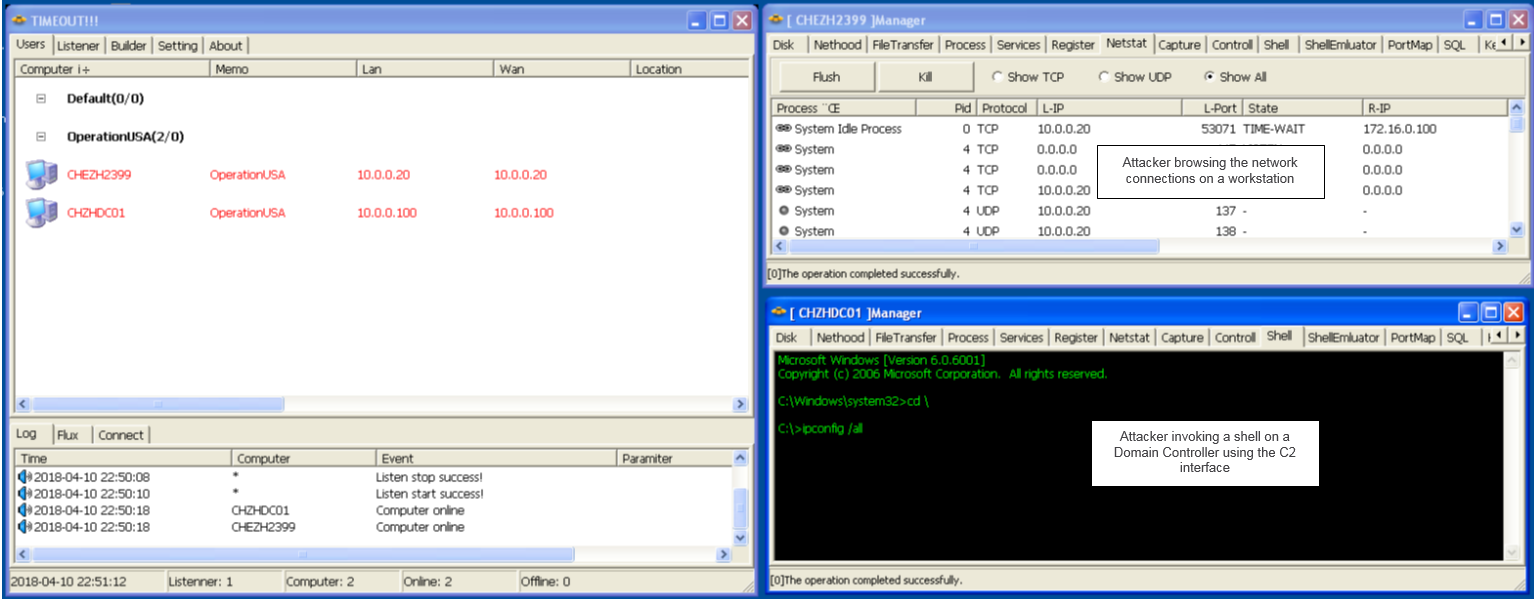 Previous pictures illustrate actions that the attacker could perform to move laterally and, for example, at some point in time, access a domain controller via UNC path, upload the PlugX payload to a directory of its choice and execute it. In this case the pictures show that the PlugX payload was dropped into c:\PerfLogs\Admin folder and then was executed using WMI. Below example shows the view from the attacker with two C2 sessions. One for one workstation and another for a domain controller.